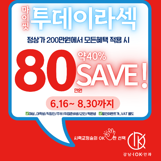 본 포스팅은 '강남IOK안과'의 정보전달 및 의료광고 내용을 포함하고 있습니다. 개인차에 따라 시술 후에 부작용이 있을 수 있으며 수술 전과 후 의료진과 충분한 상담을 받아보시기를 바랍니다.