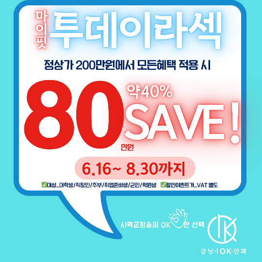 본 포스팅은 '강남IOK안과'의 정보전달 및 의료광고 내용을 포함하고 있습니다. 개인차에 따라 시술 후에 부작용이 있을 수 있으며 수술 전과 후 의료진과 충분한 상담을 받아보시기를 바랍니다.